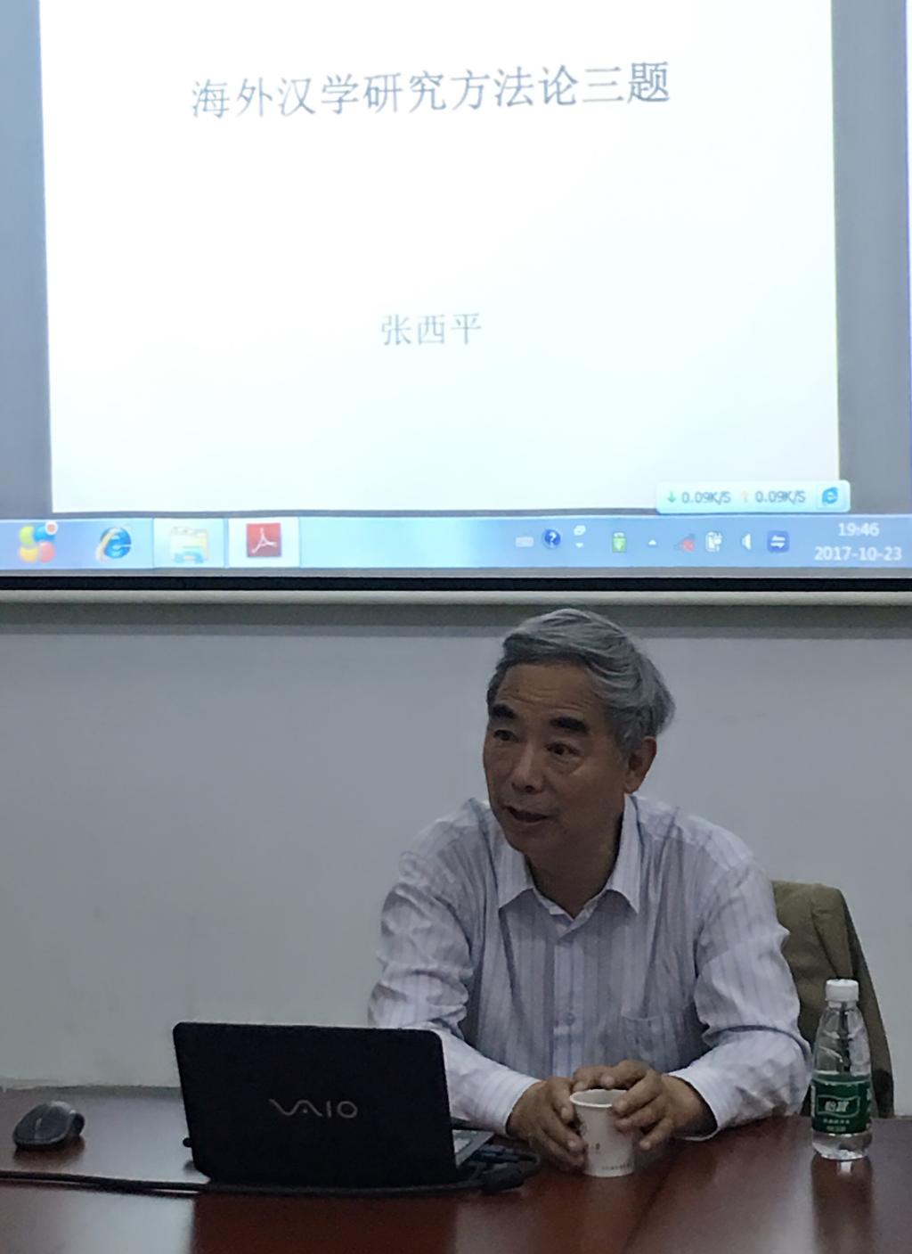 2017年10月23日晚上7点,应中心邀请,北京外国语大学比较文明与人文交流高等研究院院长、国际中国文化研究院名誉院长、《国际汉学》主编、中国社会科学院基督教研究中心副主任张西平教授到访我中心,在四教412室与中心师生围绕海外汉学研究方法论、比较文化研究的拓展路径、当代学术发展的突破点等议题进行了座谈。此次活动由中心主任张进教授主持,刘波教授、王毓红教授、张向荣教授、陈恩维教授等出席,中心博士后及博士研究生数十人参加。