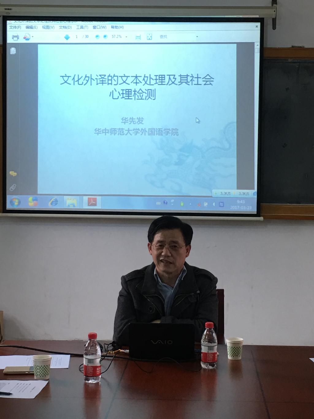 2017年3月23日上午9点半,应中心邀请,华中师范大学外国语学院博士生导师、《外国语文研究》常务副主编华先发教授到访我中心,在四教412与中心师生就文化外译的文本处理及其社会心理测试问题进行座谈。参加此次座谈活动的除了中心的师生外,还有高级翻译学院副院长李明教授等老师,以及高翻学院、商英学院的硕博研究生数十人。