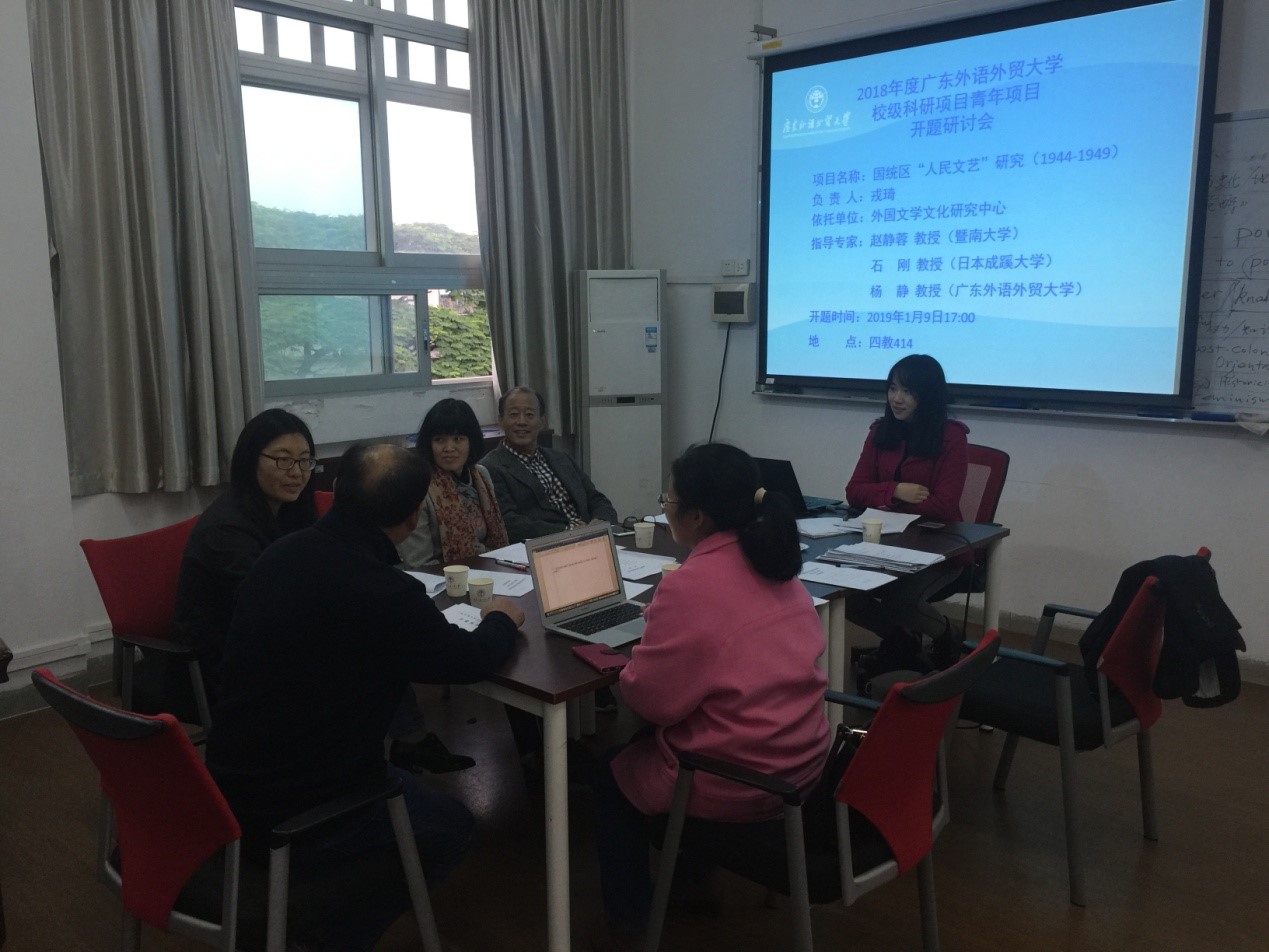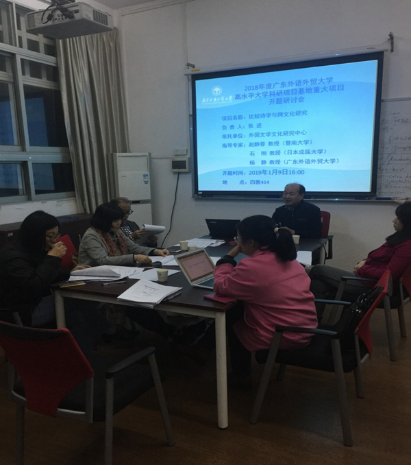 2019年1月9日16:00-19:00,中心在四教414组织了2018年度校级科研项目开题研讨会。此次研讨会指导专家包括:暨南大学中文系主任赵静蓉教授、日本成蹊大学石刚教授、广东外语外贸大学英文学院杨静教授。各项目负责人、项目组成员,外国文学文化研究中心主任张进教授及部分青年教师、博士后,中心“比较文化研究”博士点部分在读博士生等参加研讨会。