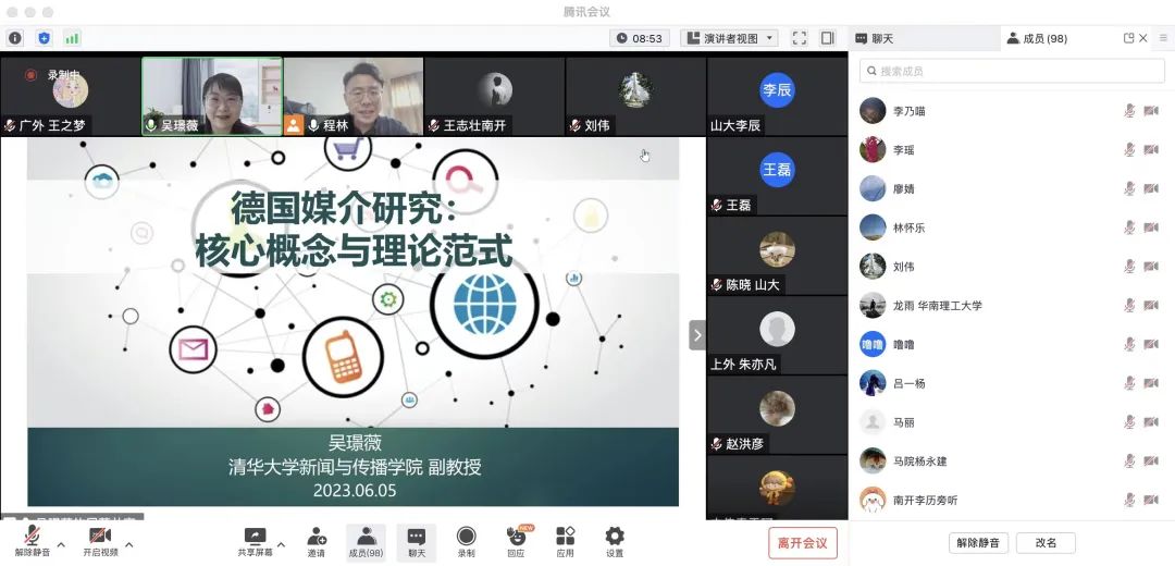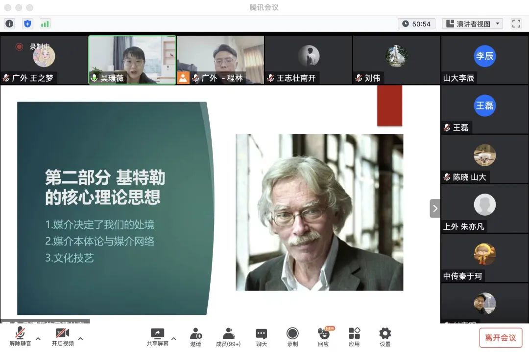 2023年6月5日下午,由广东外语外贸大学人力资源部(教师发展中心)主办、广东外语外贸大学外国文学文化研究院人文前沿跨学科研究团队承办的教学发展论坛第四讲以线上形式在腾讯会议顺利举行。本讲座由清华大学吴璟薇副教授主讲,广外外国文学文化研究院程林副教授主持,讲座主题为“德国媒介研究:核心概念与理论范式”。