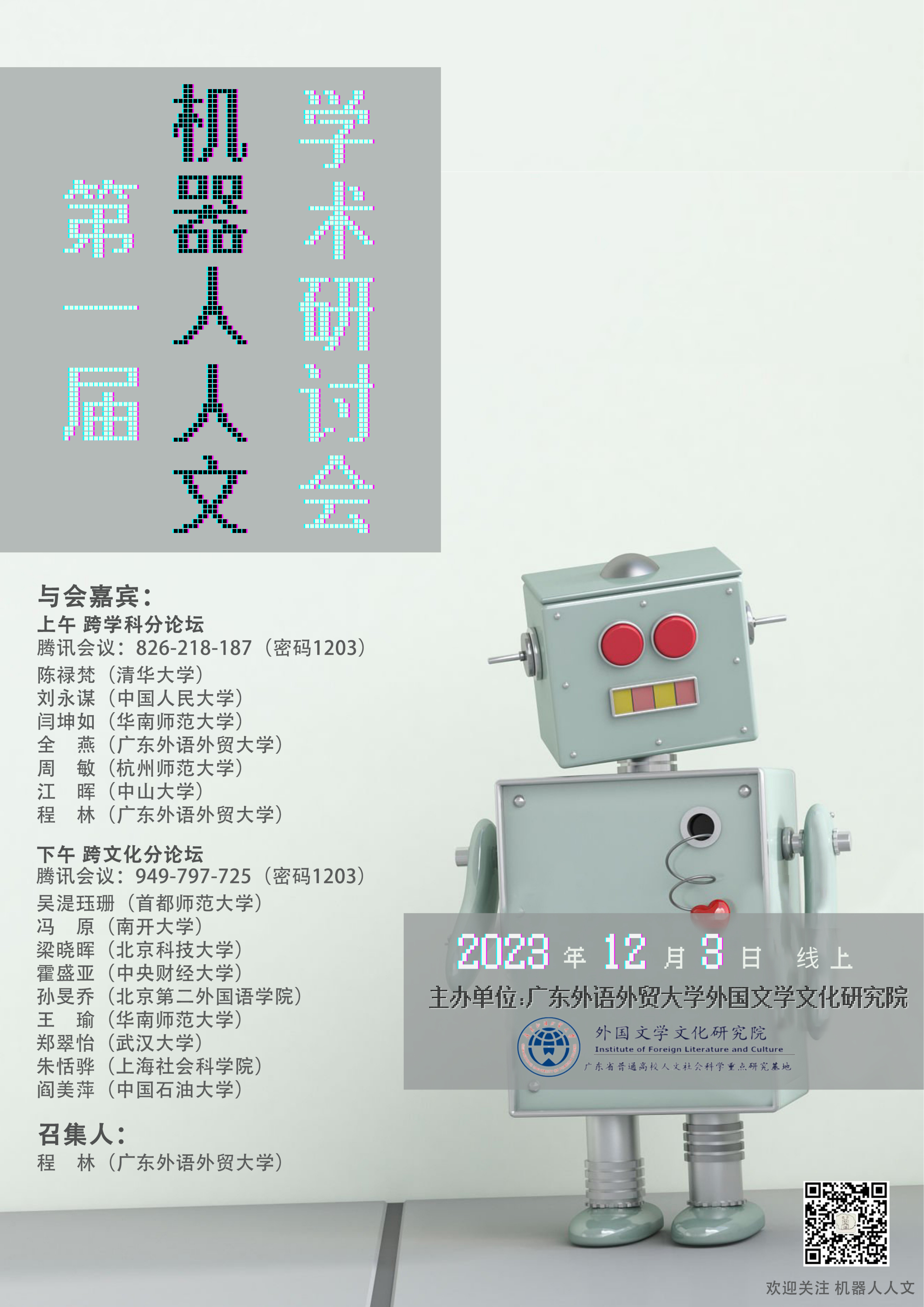 2023年12 月 3 日,由广东外语外贸大学外国文学文化研究院主办的第一届机器人人文学术研讨会在线上顺利召开。首届机器人人文学术研讨会由广东外语外贸大学程林副教授召集,来自清华大学、中国人民大学、中山大学、武汉大学、上海市社科院、华南师范大学、杭州师范大学、广东外语外贸大学等13所国内高校和科研机构的16位学者在研讨会期间发言或与谈。本次研讨会从跨学科和跨文化两个维度出发探讨了与机器人相关的人文社科议题。会议受到国内学者和高校师生强烈关注,线上参会者不仅在高峰时段达到300人上限,还有数十位师生等候参会。