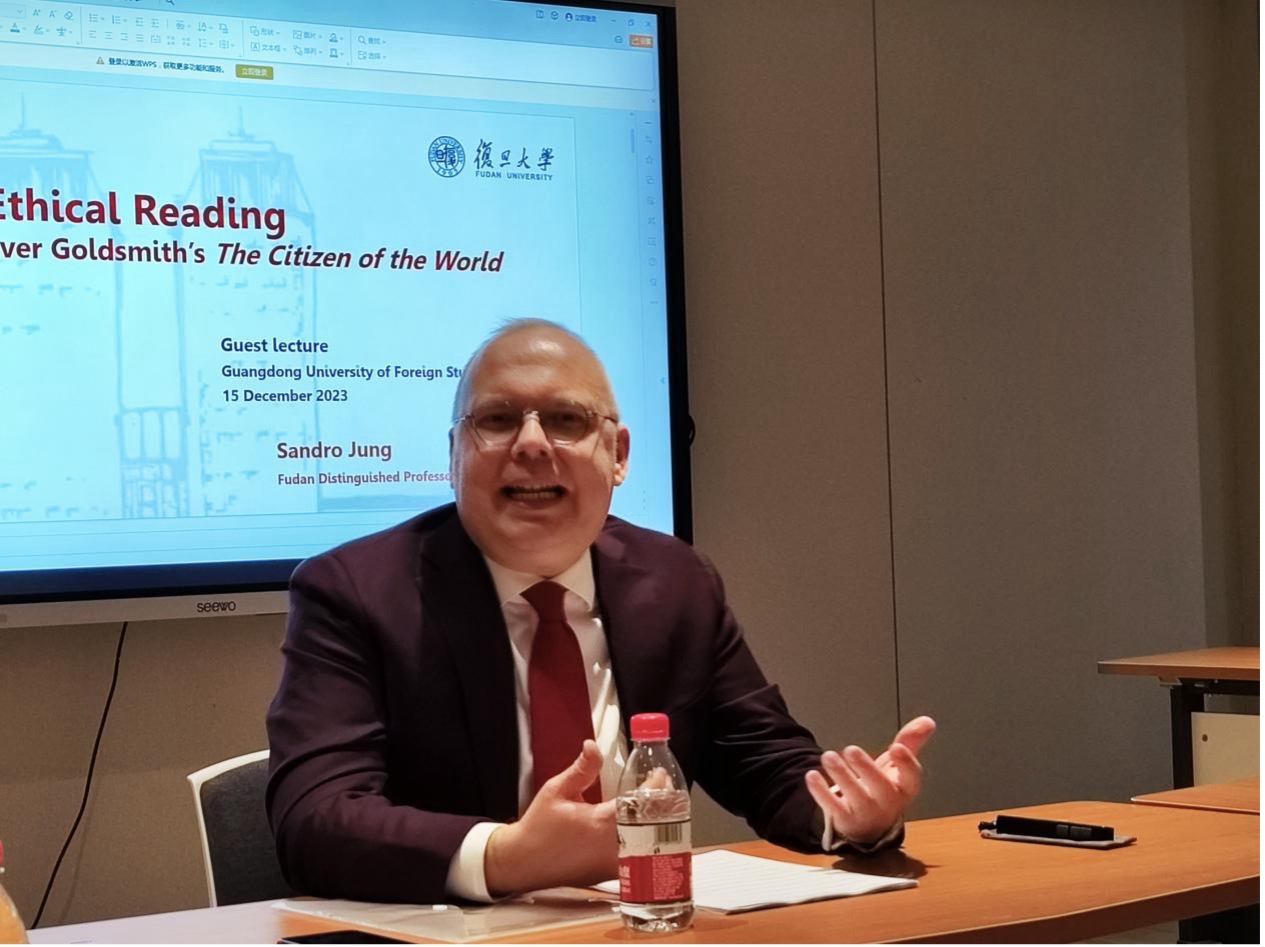 12月13日下午,我院“外国文学文化云山讲坛”第十二讲在白云山校区科研楼一楼演播厅顺利举行,复旦大学外国语言文学学院特聘教授、文本文化研究中心主任、国际期刊ANQ主编Sandro Jung教授应邀做了题为“奥利弗·戈德史密斯小说《世界公民》的伦理学解读”的讲座。此次活动由副院长刘茂生教授主持,外国语言文学学科“云山工作室”首席专家聂珍钊教授出席,以及来自校内外的数十名师生到场积极参与交流。