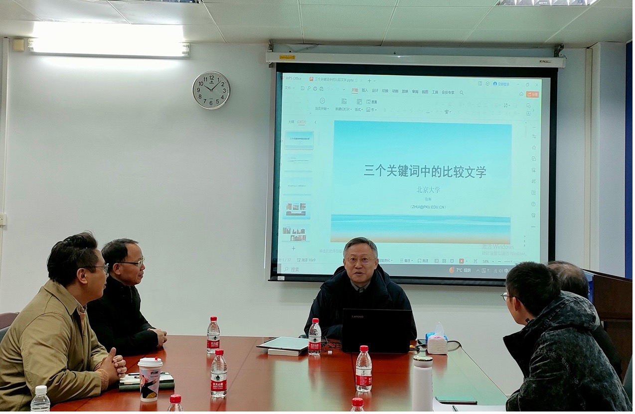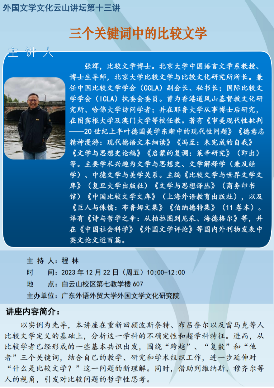 2023年12月22日上午,广外外国文学文化研究院“外国文学文化云山讲坛”第十五讲在广外白云山校区第七教学楼607室成功举行。北京大学中国语言文学系教授、北京大学比较文学与比较文化研究所所长、中国比较文学学会副会长张辉教授应邀做了题为“三个关键词中的比较文学”的讲座。此次活动由外国文学文化研究院副院长刘茂生教授致欢迎词,外国文学文化研究院程林副教授主持。中国语言文化学院院长陈恩维教授、汉语言文学系邱业祥教授,英语语言文化学院王冬青教授、杨静教授等校内数十名专家和师生参加了此次讲座。