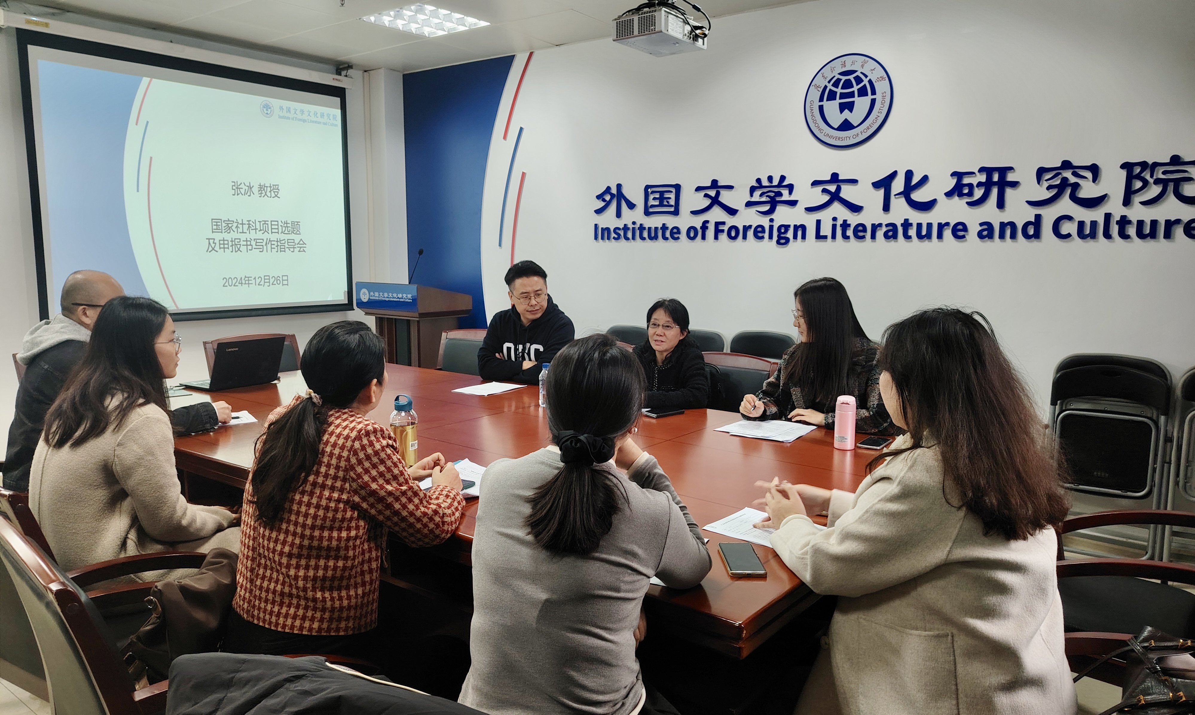 12月26日下午,外国文学文化研究院2025年高层次项目选题及申报书写作指导会在白云山校区7教617室成功举办。广东外语外贸大学外国语言文学学科云山工作室首席专家、外国文学文化研究院研究员张冰教授应邀为我校教师进行指导,许栋梁、杨俊婷等外国文学文化研究院及西方语言文化学院德语系、俄语系的中青年学者参加了指导会。在指导会期间,张冰教授与各位申报者就选题、论证、申报书写作等方面进行了探讨,并给予了一对一的耐心指导。